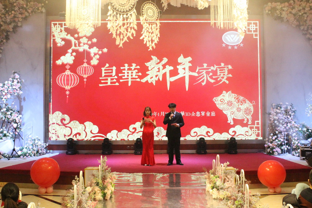 1月27日中午,由集團皇華國際大酒店主辦的“夢想起航再創(chuàng)輝煌”新年家宴在宴會大廳隆重舉行。集團董事長管民良、總經(jīng)理管民祥、副總經(jīng)理周耀庭、黃益寶、財務(wù)總監(jiān)郭正基、皇華國際大酒店董事長王衛(wèi)紅、總經(jīng)理夏曉春、建宇機關(guān)員工及皇華的全體員工們參加了此次盛宴。