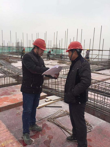 也許是再一次考驗項目部,12月30日上午10點開始南京還下起了中雪,一直持續到晚上,這無疑給搶工封頂增加了很大的難度,但并沒有削減大家的沖刺激情,31日早上5點,在勞務經理任永艮帶領下項目部成員齊上陣,到樓頂清掃模板上的積雪,確保在工人師傅上工前清出作業面。經過項目所有人員的共同努力,在31日晚7點開始澆筑屋面結構的混凝土,終于元月1日凌晨5點順利封頂。