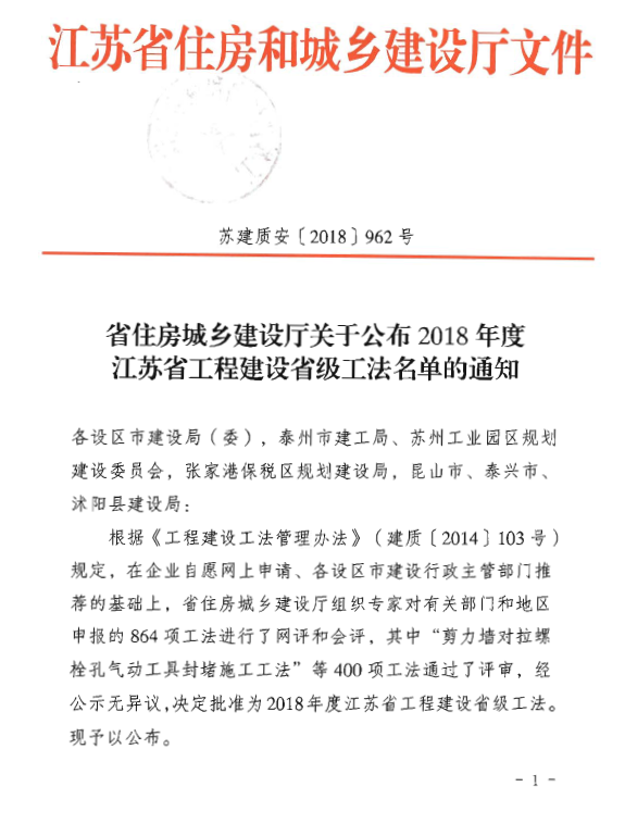 工法是企業標準的重要組成部分,是衡量企業技術水平和施工能力的重要標志,省級工法則是代表了江蘇省施工工藝標準的最高水平。集團各分公司特別是揚州分公司堅持以技術創新引領核心競爭力提升,深入開展施工管理創新和技術創優活動,揚州分公司王禮亮、柏甫燕等同志積極組織工法編寫及申報,此次獲評省級工法已是他們二次獲此殊榮。