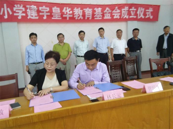 伯勤小學楊骎校長首先代表學校致歡迎辭,對建宇?皇華教育基金的成立表達了謝意和敬意。皇華國際大酒店王衛紅董事長代表集團與伯勤小學楊骎校長簽署二十萬元基金捐贈協議。隨后伯勤小學教導主任張敏宣讀了《伯勤小學建宇?皇華教育基金會章程》,受助學生代表上臺發言,感謝學校和建宇集團的關心和培養。