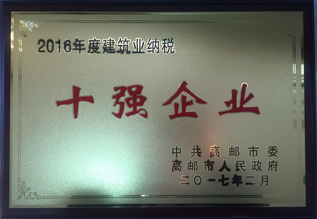 2017年2月6日,從高郵市政府舉行的高郵市建筑業發展大會上傳來喜訊:我集團被授予“高郵市建筑業納稅十強企業”榮譽稱號。