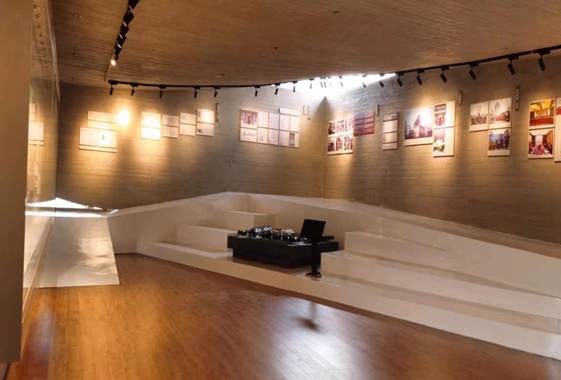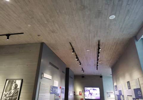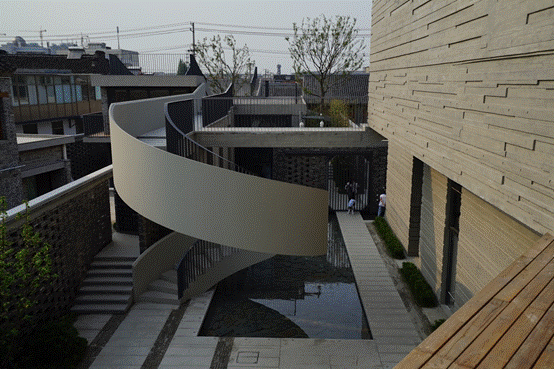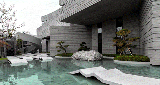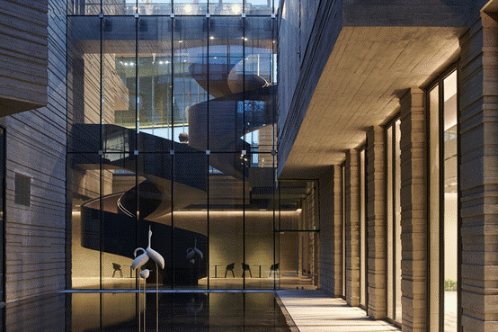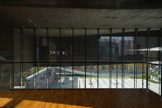 集團成立技術(shù)攻關(guān)小組,克服施工困難,為達到弧形、凹凸,連續(xù)無通縫等各類木紋清水砼表面效果,室內(nèi)以10cm的統(tǒng)一模數(shù)適當(dāng)弱化肌理,避免喧賓奪主;室外則運用了4cm、6cm、10cm三種模數(shù),在一層為通長的肌理,二層出現(xiàn)長短變化,給人帶來水波蕩漾的意象遐思。