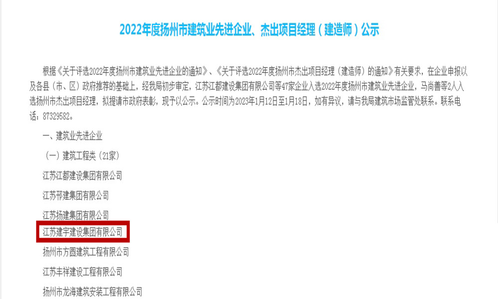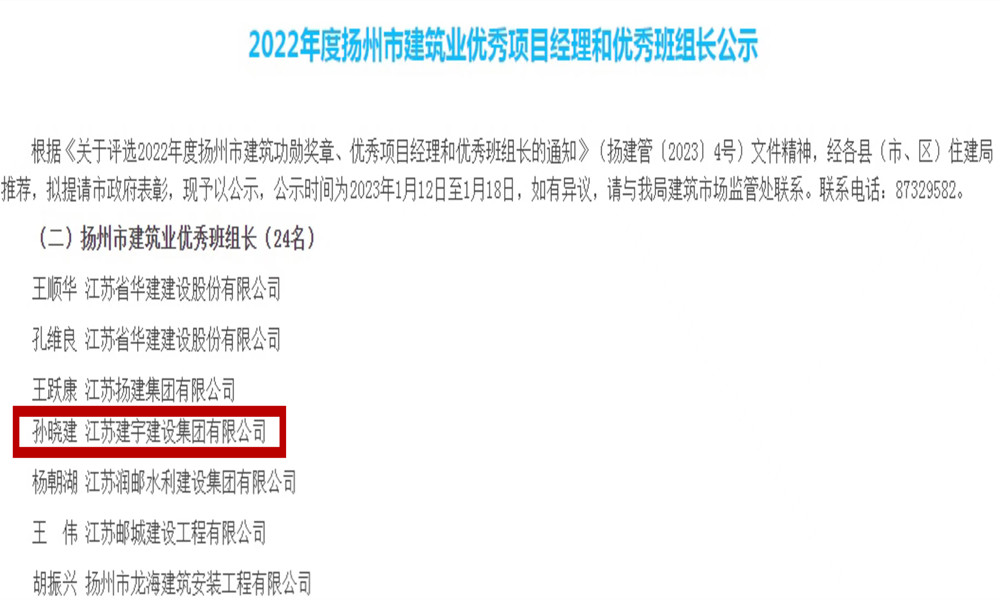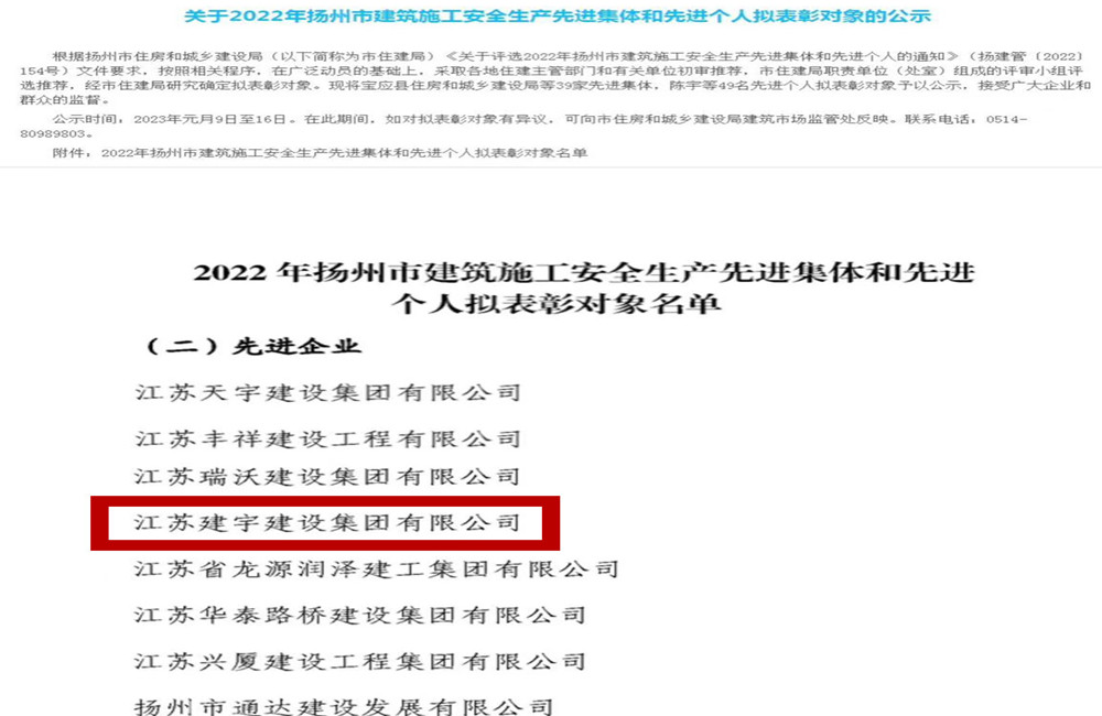 近日,集團被揚州市人民政府評為2022年度揚州市建筑業先進企業,這是集團第十二次獲此殊榮。同時,集團被揚州市住房和城鄉建設局評為2022年度揚州市建筑施工安全生產先進集體,孫曉建同志榮獲建筑業優秀班組長。