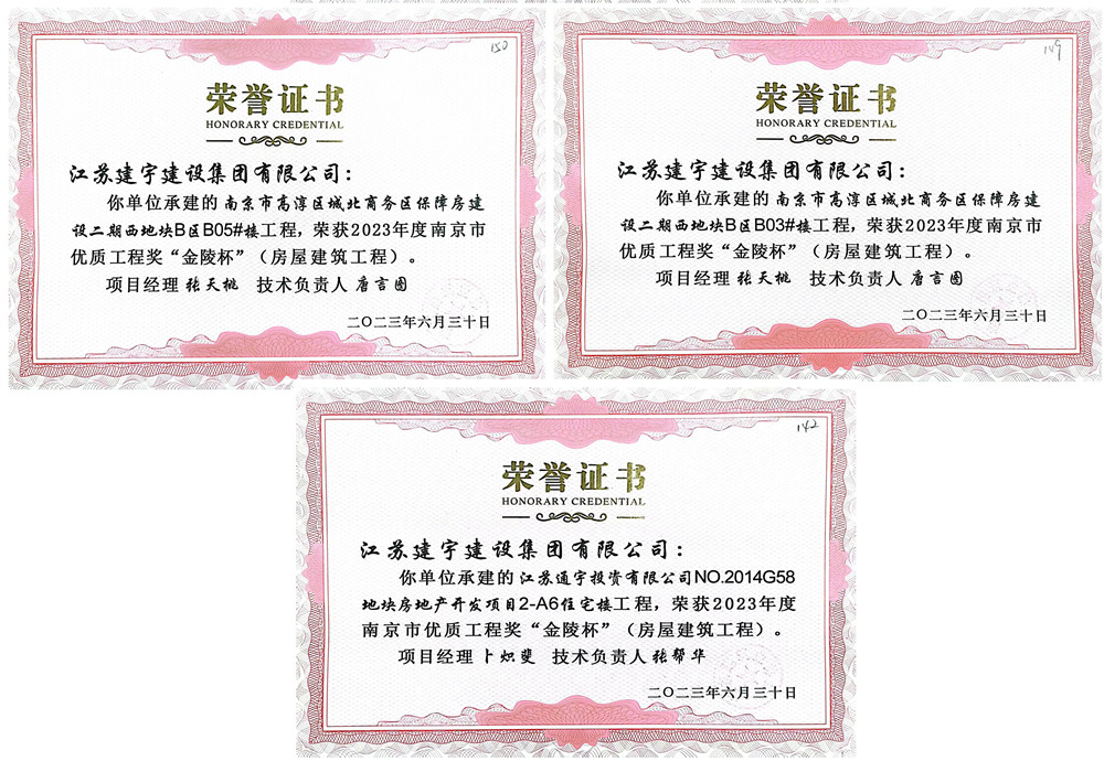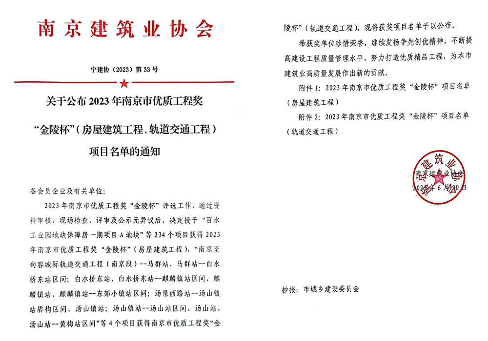 “金陵杯”是南京市建筑工程質量領域的最高榮譽,代表著全市范圍內各建筑施工企業質量管理的領先水平,評審標準高,數量控制嚴。南京分公司嚴抓管理,不畏強手,承建的高淳區城北商務區保障房建設二期西地塊B區B03#、B05#、江蘇通宇房地產開發項目2-A6住宅樓等三個項目榮獲2023年南京市優質工程獎“金陵杯”。