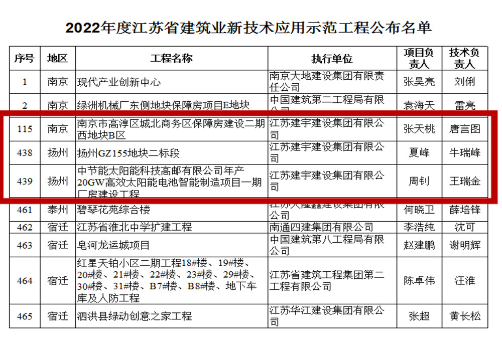 江蘇省建筑業新技術應用示范工程是指新技術含量高,在全省有一定規模和影響的工程。集團南京分公司承建的高淳區城北商務區保障房、揚州分公司承建的GZ155地塊二標段和高郵分公司承建的中節能一期廠房建設工程等三個項目榮獲2022年度江蘇省建筑業新技術應用示范工程。