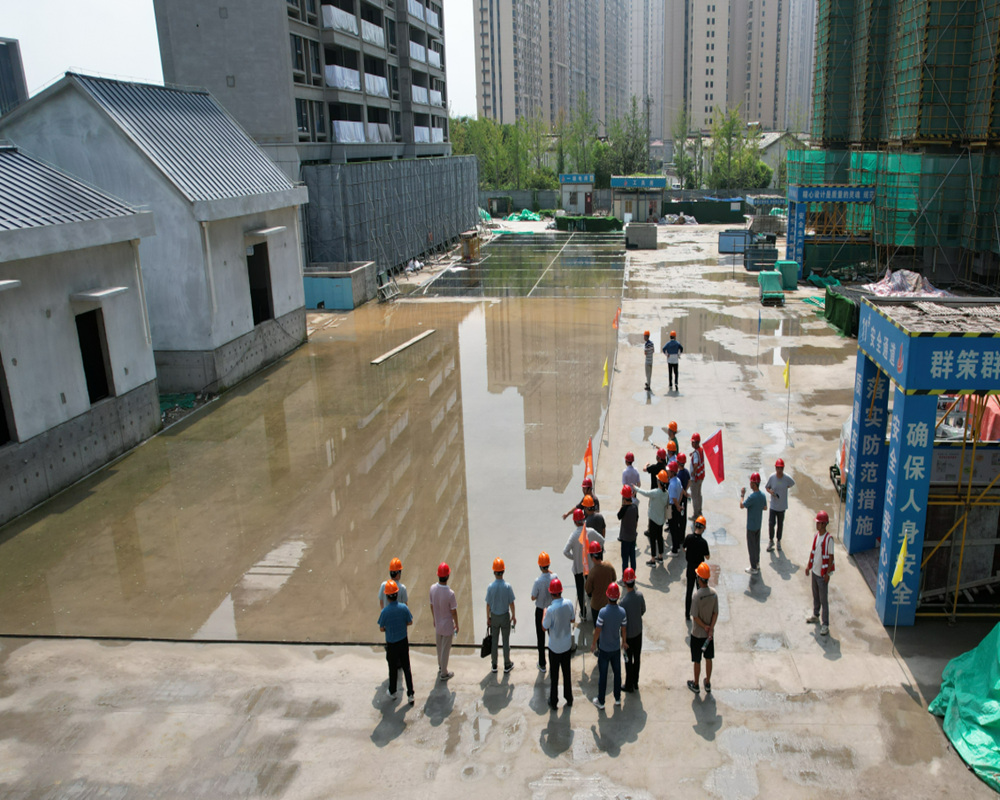 全體觀摩人員聽取了項目簡介后,分成了兩組深入施工場地進行了細致地觀摩學習。重點觀摩了18#樓的一層實體成型質量及觀感、二層的二次結構和石膏砂漿粉刷的工序樣板展示,11#樓一層的實測實量、門窗部門的細部處理,地庫頂板的48小時的結構蓄水等。