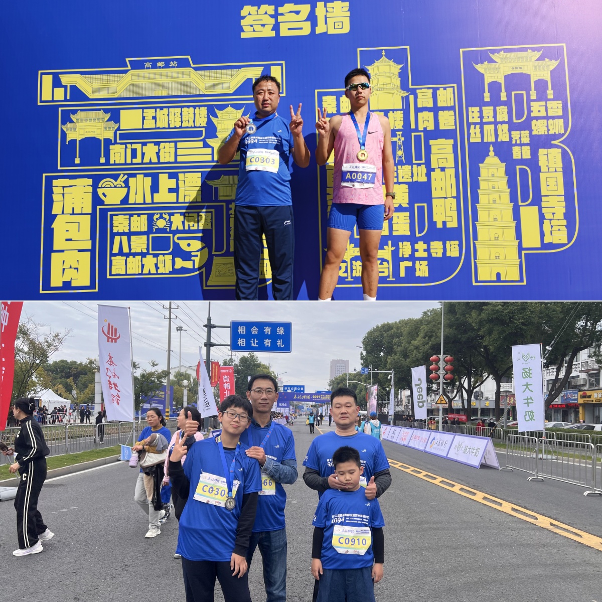 賽道上,建宇跑團成員們并肩作戰,特別稱贊的是跑團中還有三對父子,分別來自南京公司的唐言圖父子、揚州公司的吳俊父子、高郵公司的丁文煒父子,其中最大的唐書舜參加了21公里半程馬拉松。大家一邊欣賞沿途的自然風光,一邊相互鼓勵,保持著較好的節奏,共同向終點沖刺。
